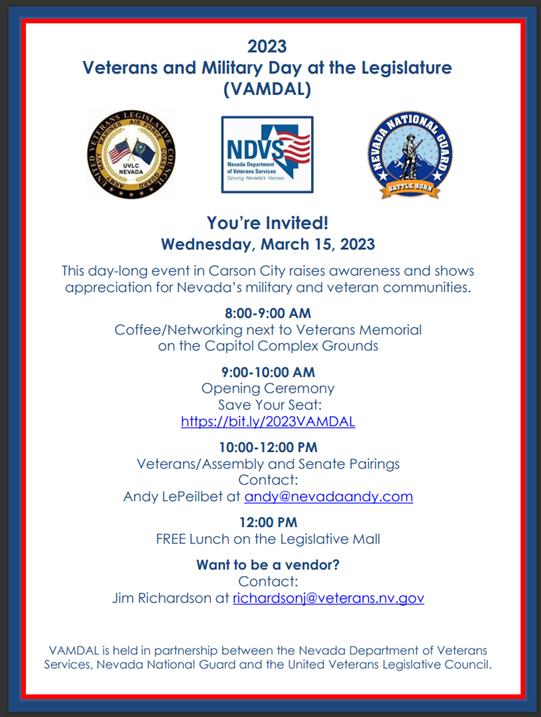 • **NEW LOCATION** VVA & AVVA Chapter 989 Meeting & Election of Officers April 16, 2026 at 14:00 – 16:00 American Legion Hall Post No 30n730 Fourth St, Sparks, NV 89431, United States