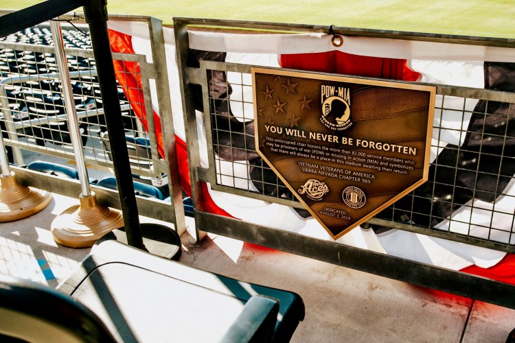 VVA 989 is pleased to have found friends and patriots with the Reno Aces Ball Club. We first met when we approached the Aces about providing space for a POW/MIA Chair of Honor in Greater Nevada Field during the 2019 baseball season. The Aces were very receptive to the proposal and arranged for a formal dedication of the Chair by VVA 989 during Military Appreciation Night on August 3rd 2019. Since then, we have worked with the Aces to ensure that our POW/MIA are not forgotten.