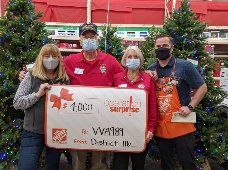 Peggy Koniack (l) and David Slater (r) of the Home Depot stores in Carson City and South Reno, present the actual “Home Depot Foundation” check to J. R. & Brigitte Stafford for VVA 989’s “From CAMOS to Classrooms” scholarship fund for 2021. VVA 989 has been giving scholarships to veteran students at UNR and TMCC since 2013 and Home Depot’s contribution this year goes a long way to perpetuating our scholarships into the future.