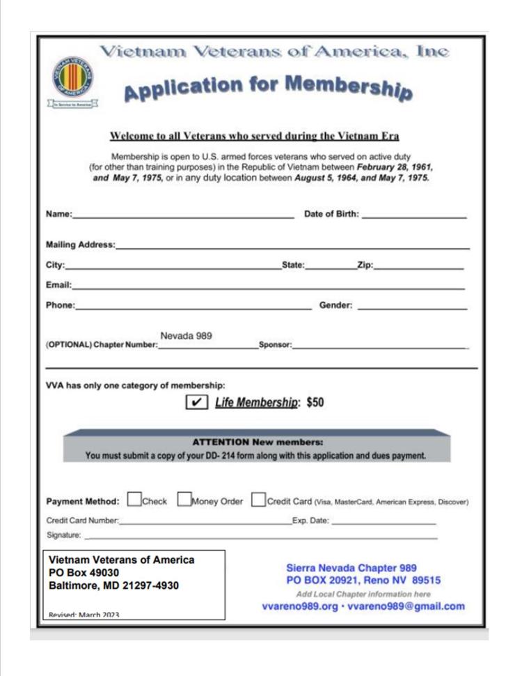 Sierra Nevada Chapter 989 meets the 3rd Thursday of each Month at 1400 hours, inside VFW Post 9211, 255 VFW Historic Lane (formerly Burris Lane) in Reno. (Just off of Moana & Baker Lane)