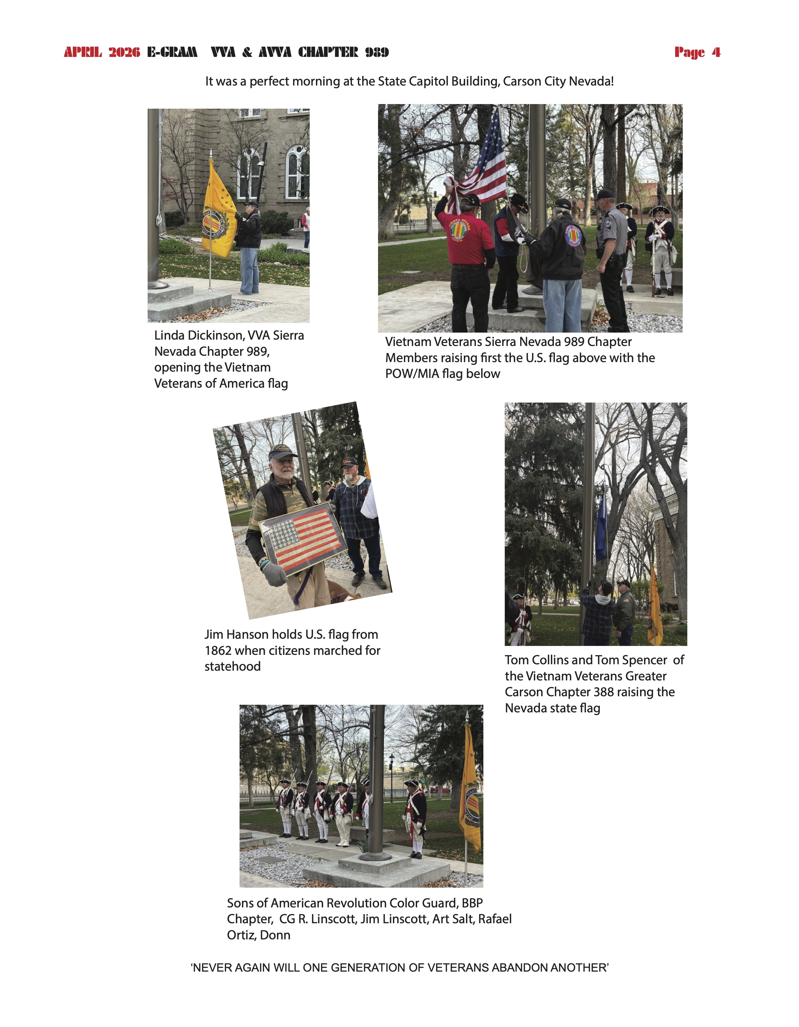 • **NEW LOCATION** VVA Chapter 989 Meeting & Election of Officers April 16, 2026 at 14:00 – 16:00 American Legion Hall Post No 30n730 Fourth St, Sparks, NV 89431, United States