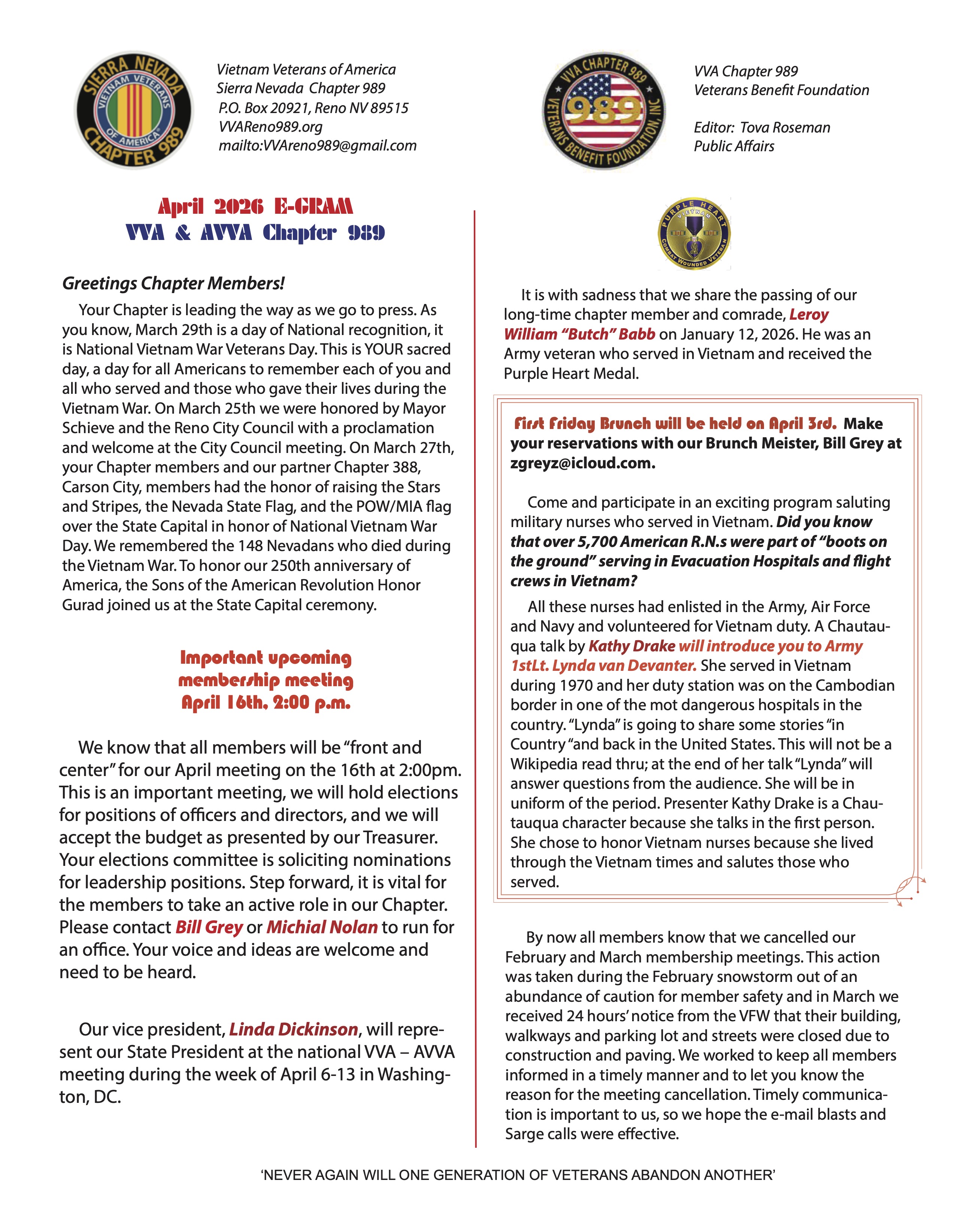 • **NEW LOCATION** VVA Chapter 989 Meeting & Election of Officers April 16, 2026 at 14:00 – 16:00 American Legion Hall Post No 30n730 Fourth St, Sparks, NV 89431, United States