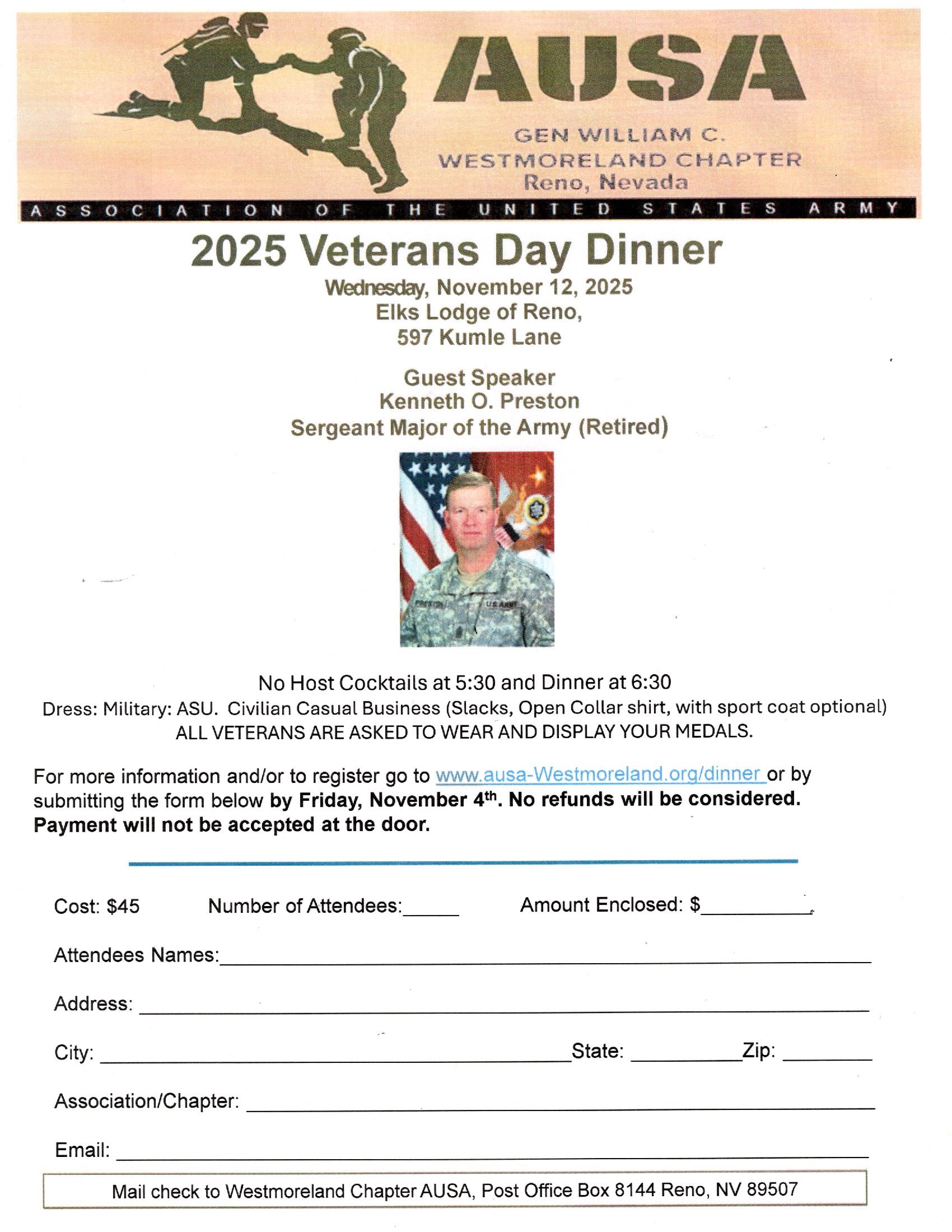 • Memorial Day Ceremony May 25, 2026 at 11:00 – 12:30 Northern Nevada Veterans Memorial Cemetery, Fernley • ALL WELCOME • Info: www.supportnnvc.org