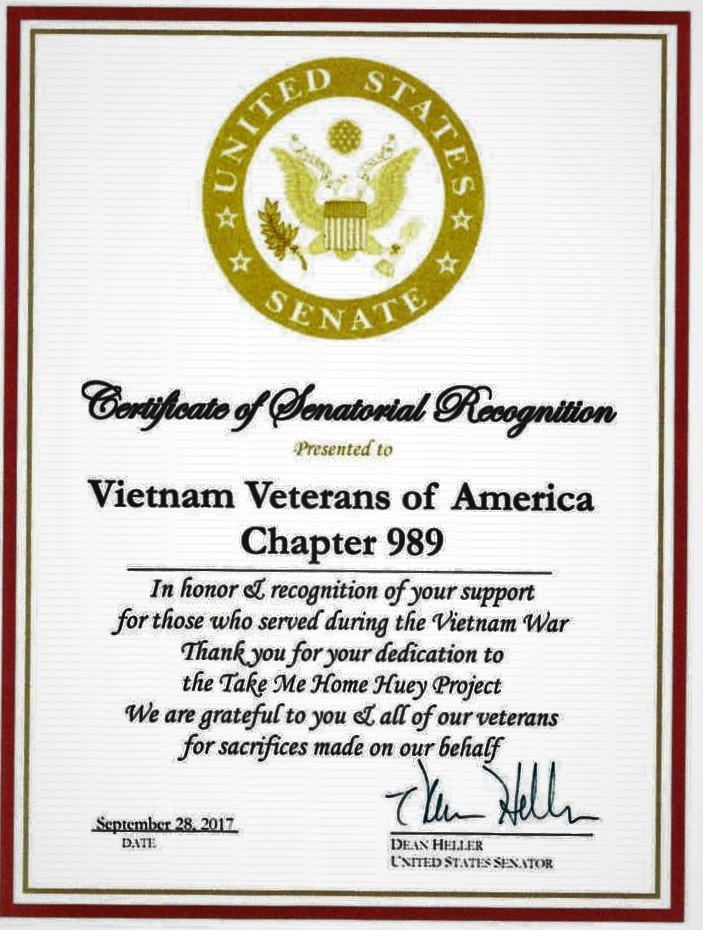 Vietnam Veterans of America Sierra Nevada Chapter 989 receives Veteran Supporter of the Month Recognition and Honor. Most of the seats were full inside the Old Assembly Chambers, located on the second floor of the Capitol Building, above the Governor’s Office.Members of the Vietnam Veterans of America Sierra Nevada Chapter 989 had to save the Governor a front row seat. He slid into his chair just as Nevada Department of Nevada Services Director Kat Miller began joking about having to adjust the podium before the ceremony could begin. Her smiles and jokes quickly took a serious turn when she began highlighting just a few of the reasons this Reno VVA Chapter was selected to receive Veteran Supporter of the Month.“This group shares a bond and a commitment that never again will one generation of veterans abandon another,” Miller said. Before introducing Governor Sandoval, she read a lengthy list of ways this group provides support to the veteran community ranging from assisting those with PTSD, to supporting non-profits like the Veterans Guest House or championing veteran-friendly legislation during the Nevada Legislature. The Governor told the group how much he respects their military service, explaining his father served in WWII. He spoke about his visits while serving as Governor to Nevada military members serving overseas and what a lasting impression that made on him. In closing, he motioned to a giant circular seal in the middle of the chamber that features the head of former President Abraham Lincoln. Sandoval said, “In the shadow of Abraham Lincoln I want to paraphrase one of his famous quotes; I like to see a man proud of the place in which he lives, so that his place is proud of him.” VVA Chapter 989 President, Linda Dickinson noted the group was relatively new, having formed in 2006. She said, “We started with just 25 members and have grown to more than 150 members in the Reno and Sparks area.” ( By Terri Hendry )
