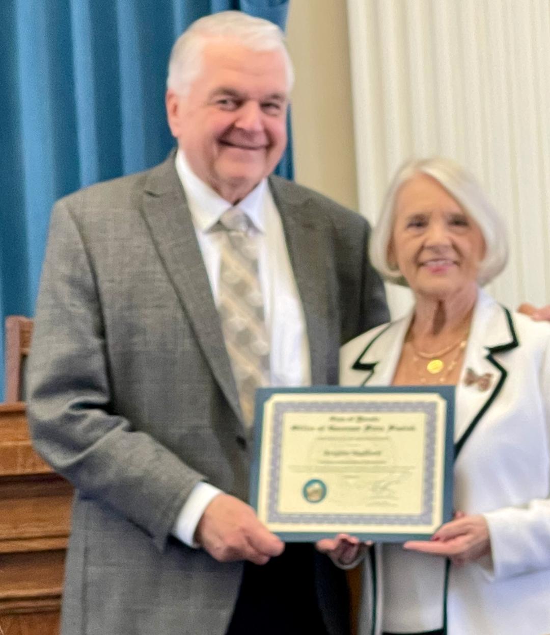 In a ceremony inside Carson City’s Old Assembly Chambers, Linda Dickinson was honored as Veteran of the Month during a special ceremony on September 6, 2019. Governor Steve Sisolak and NDVS Director Kat Miller presented Dickinson with a certificate and a custom Veteran of the Month pin. Linda is the immediate Past President of the Sierra Nevada Chapter 989 of the Vietnam Veterans of America. She recently completed four terms as Chapter President (April 2015 – April 2019).