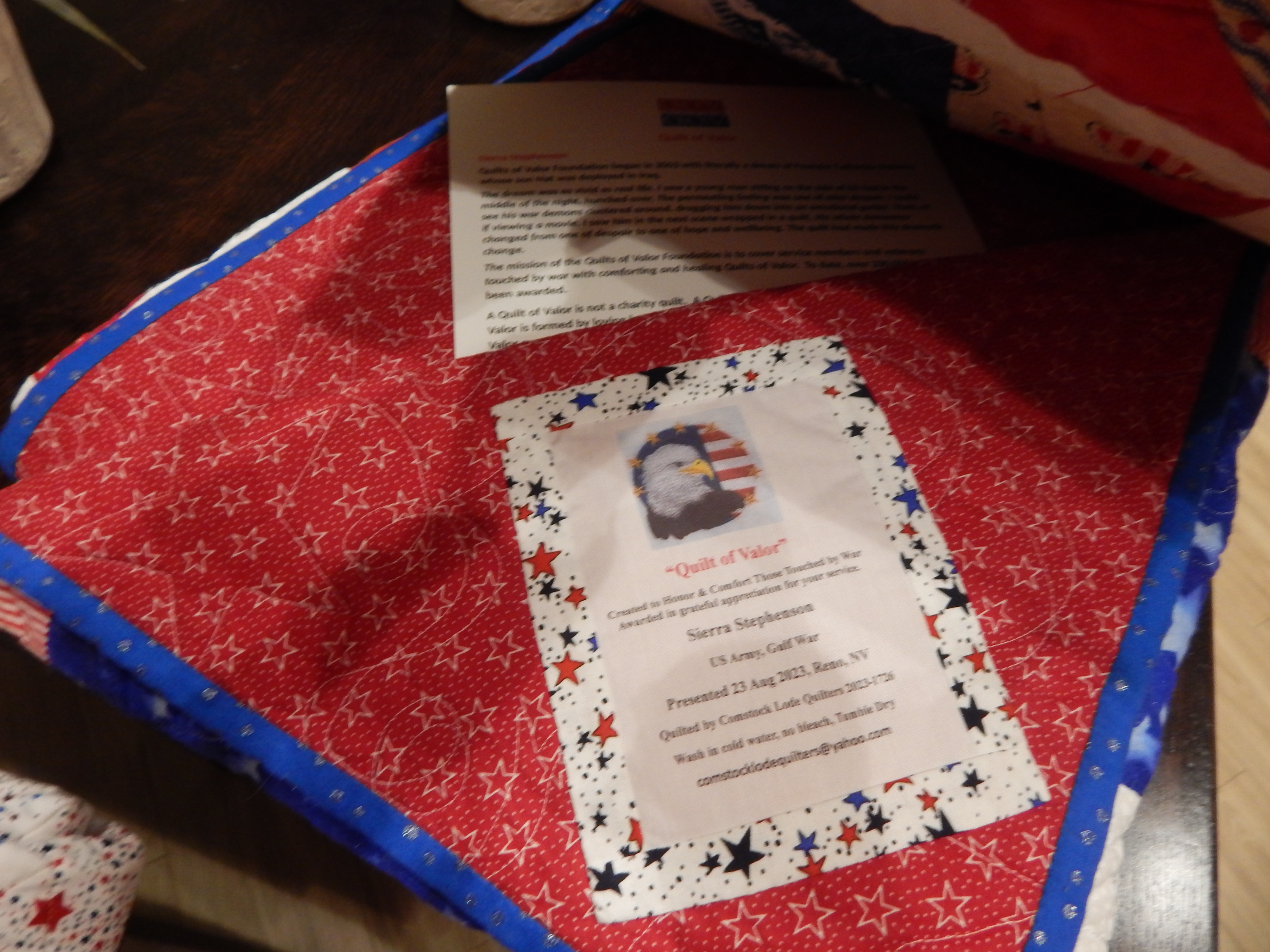 Each quilt is individualized with the Veterans name, branch of service and conflict. And, there’s a presentation date sewn into the quilt. Much love and attention to detail goes into the quilts..