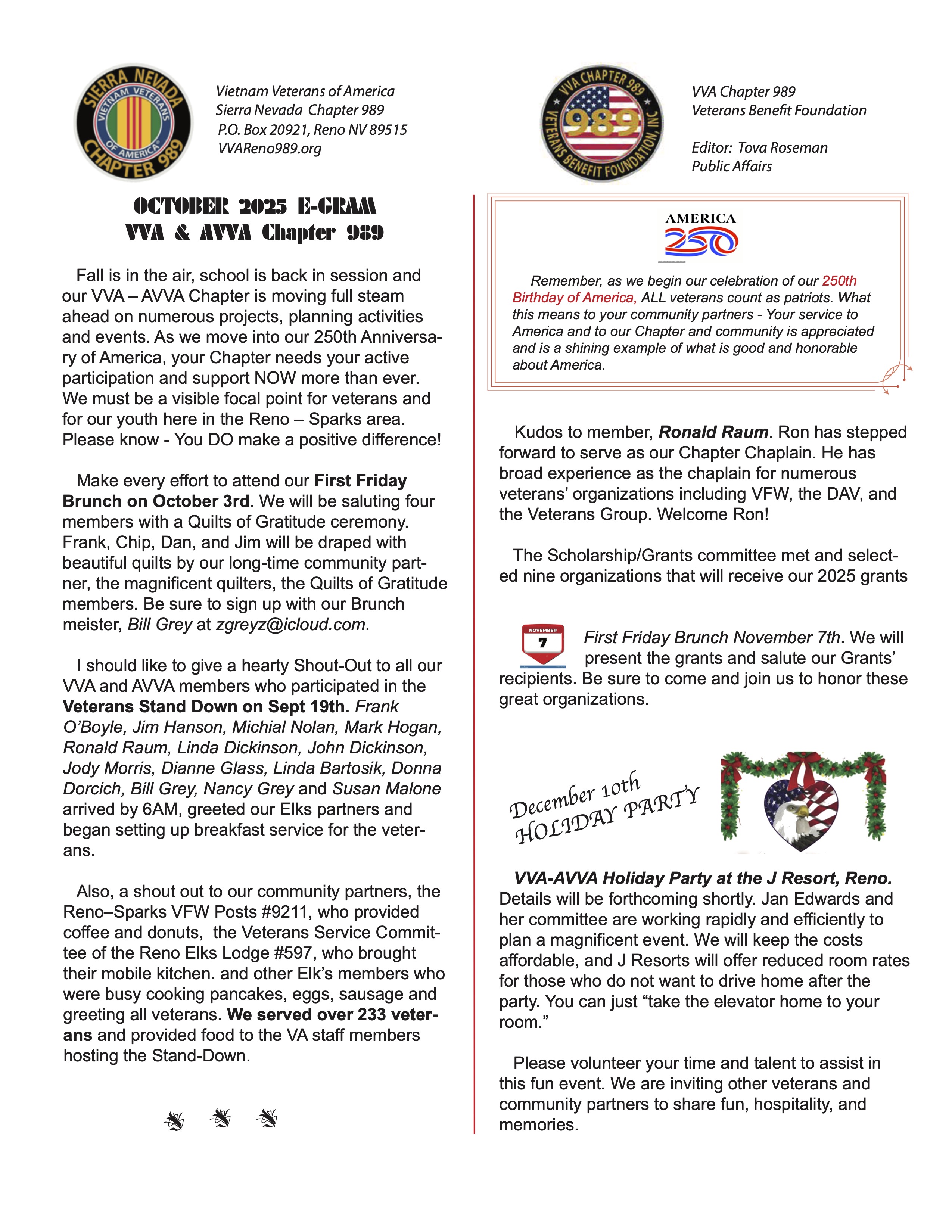 • **NEW LOCATION** AVVA Chapter 989 Meeting April 16, 2026 at 14:00 – 16:00 American Legion Hall Post No 30n730 Fourth St, Sparks, NV 89431, United States