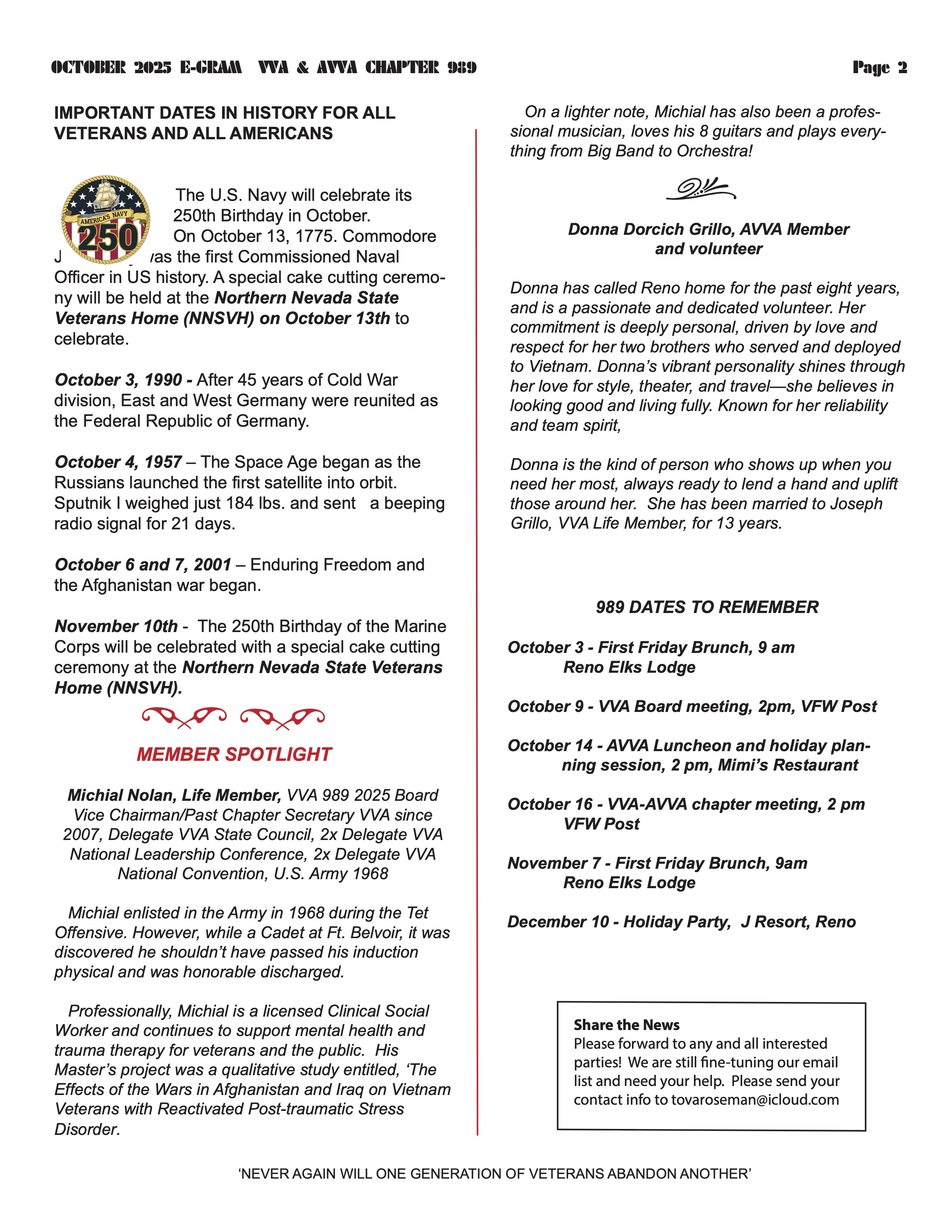 • **NEW LOCATION** AVVA Chapter 989 Meeting April 16, 2026 at 14:00 – 16:00 American Legion Hall Post No 30n730 Fourth St, Sparks, NV 89431, United States