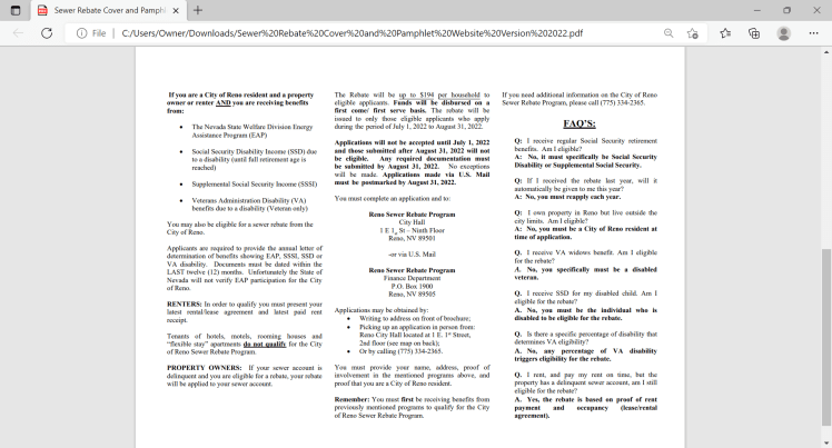 The City of Reno has once again approved the sewer rebate program. You may be eligible, if you are a City of Reno resident and a property owner or renter and you are receiving benefits from The (VA) Veterans Administration Disability benefits due to a disability (any percentage / Veteran only).