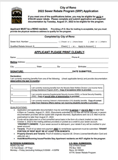 City of Reno Sewer Rebate Program – July 1 – Aug 31