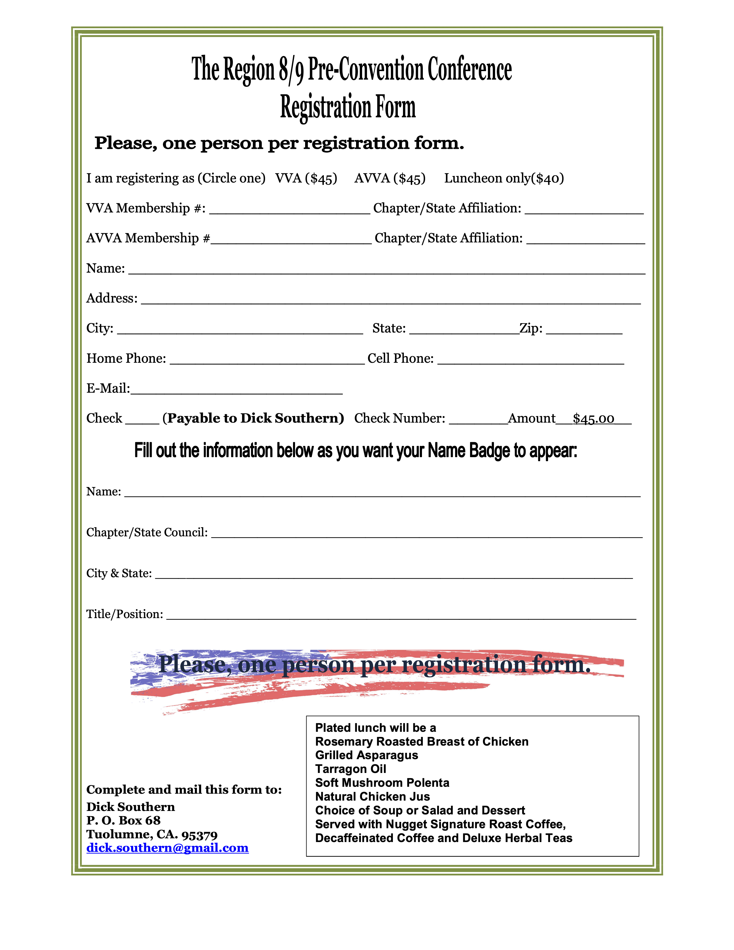 • **NEW LOCATION** VVA Chapter 989 Meeting & Election of Officers April 16, 2026 at 14:00 – 16:00 American Legion Hall Post No 30n730 Fourth St, Sparks, NV 89431, United States