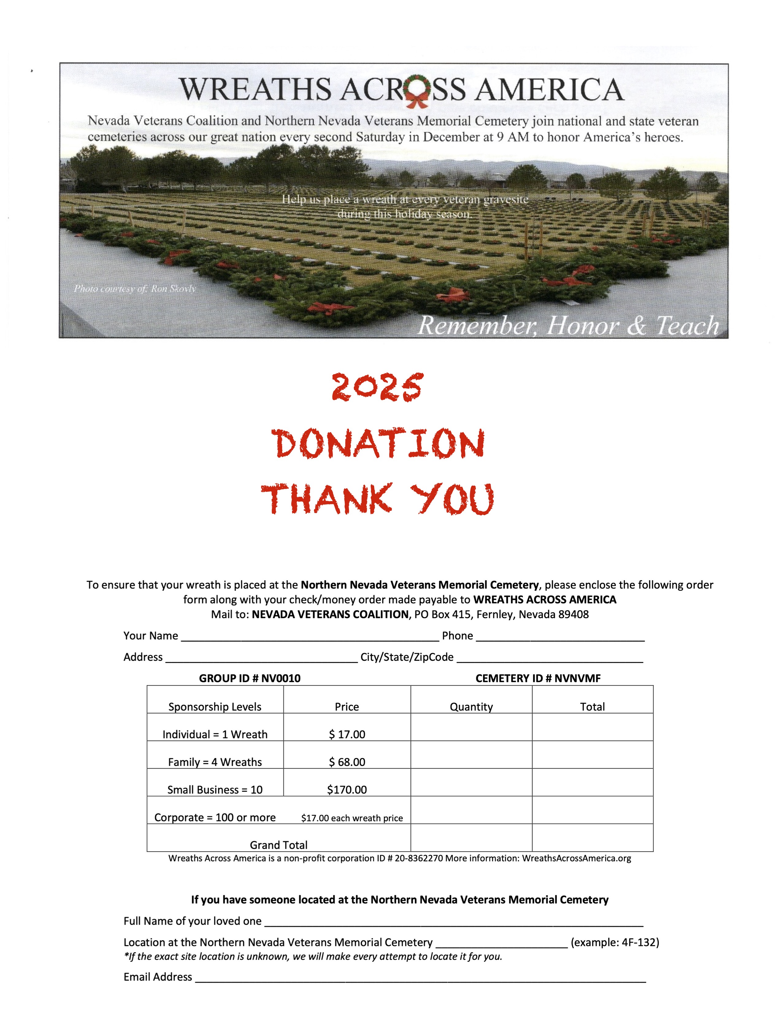 • Memorial Day Ceremony May 25, 2026 at 11:00 – 12:30 Northern Nevada Veterans Memorial Cemetery, Fernley • ALL WELCOME • Info: www.supportnnvc.org